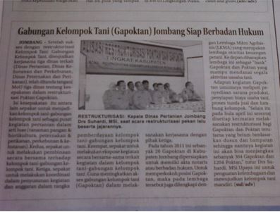 Pada tahun 2011 ini sebanyak 20 Gapoktan di kabupaten Jombang dipersiapkan untuk memiliki akta notaris atau berbadan hukum. Untuk memperkokoh posisi Gapoktan, maka pada lembaga tersebut juga dilengkapi dengan Lembaga Mikro Agribisnis (LKMA) yang merupakan lembaga otoritas keuangan petani. Ke depan diharapkan lembaga ini sebagai "bank" Gapoktan dan Poktan yang mampu mendanai segala aktivitas usaha tani.